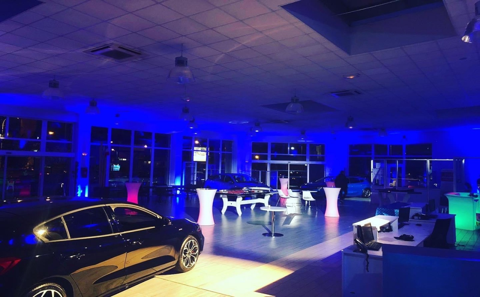 Nous avons réalisé pour notre client FORD son lancement de produit pour la nouvelle Mustang, Avec une scénographie adapté à ces besoins. Eclairage architectural intérieur et extérieur et location de mobiliers (mande debout, bar pliant, lycra et housse de décoration, table de poker,). Nous avons également exécuté le montage d'une scène en 3X4 avec pupitre et fronton personnalisé. Nous avons sonorisé la conférence avec des enceintes en point source avec une retransmission live sur écran géant LED.